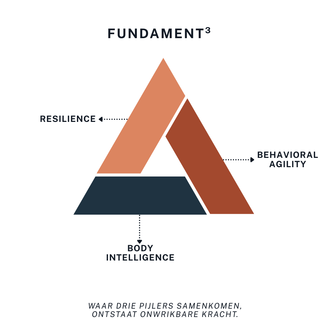 Fundament³ is gebouwd op het principe dat duurzame prestaties ontstaan wanneer Mentaal, Fysiek en Gedrag gelijktijdig worden versterkt.
